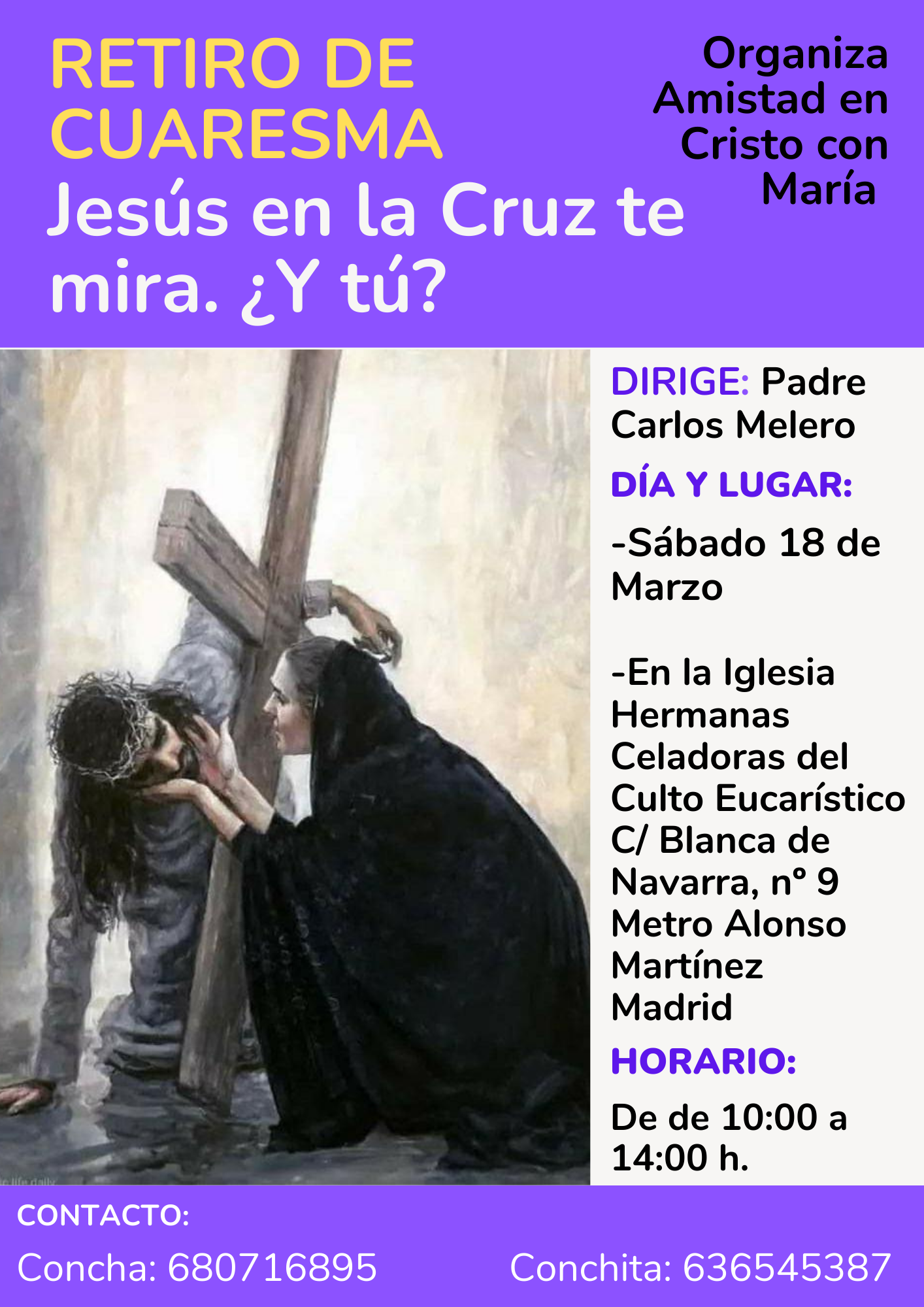 5 marzo, 2023 de Beatriz Azañedo Retiro de Cuaresma sábado 18 de marzo «Jesús en la Cruz te mira. ¿Y tú?» Desde Amistad en Cristo os invitamos a este Retiro para prepararnos a vivir la Cuaresma y tener preparados el corazón para recibir la Pascua. ¡Os esperamos! Cualquier duda escribid a Concha o a Conchita. Compártelo: Haz clic para compartir en X (Se abre en una ventana nueva) X Haz clic para compartir en Facebook (Se abre en una ventana nueva) Facebook Me gusta Cargando... Relacionado