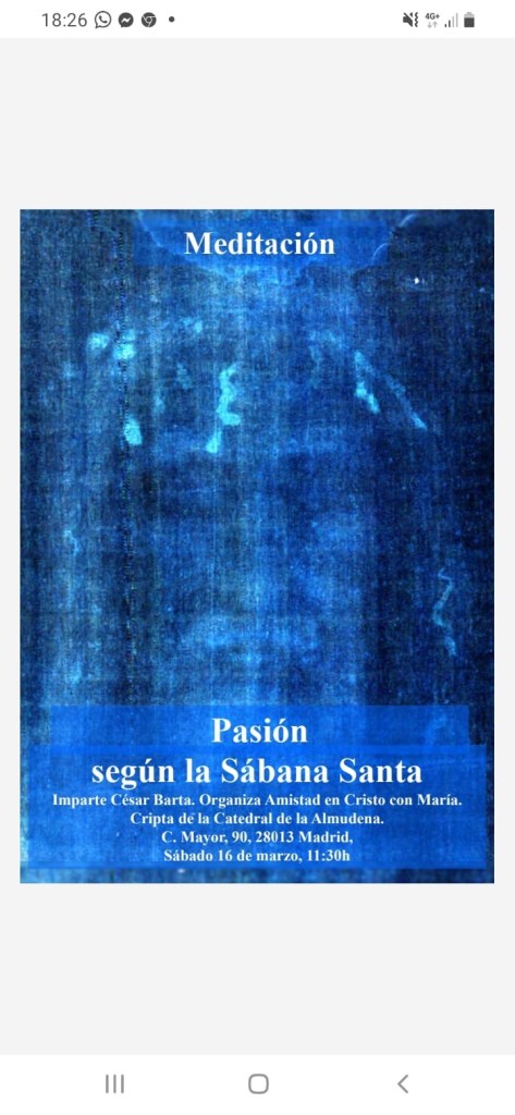 -Despues tendremos una conferencia sobre Meditación de la pasión según la Sabana Santa. Qué nos la impartirá: Cesar Barta, (Fisico), miembro del Centro Español de Sindonología y su esposa. Terminaremos con un ratito de Adoracion y Exposición del Santísimo, dirigido por el P.Iniesta.