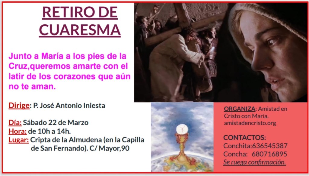 10 marzo, 2025 de Beatriz Azañedo Retiro de cuaresma 2025 ¿Cuento contigo esta mañana del sábado para estar y acompañar a nuestro Jesús amado a los pies de la Cruz junto con nuestra Madre? ¿Le damos estas horas de nuestro tiempo? Concha Puig Compártelo: Haz clic para compartir en X (Se abre en una ventana nueva) X Haz clic para compartir en Facebook (Se abre en una ventana nueva) Facebook Me gusta Cargando... Relacionado